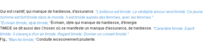 Signification parue en 2009 (source la-definition.fr).Merci à Baudouin et Irène pour la numérisation du mot timide.