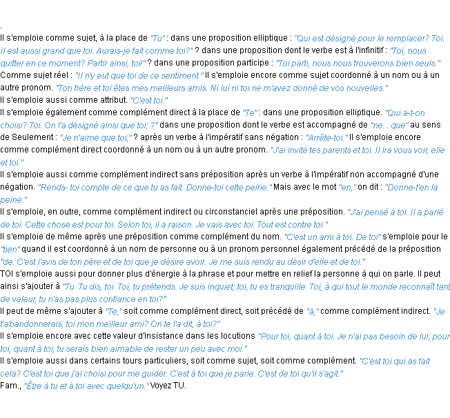 Définition du mot « toi » par l’équipe de la-definition.fr (édition de 2011).Merci à Gaston et Cerise pour la numérisation du mot toi.