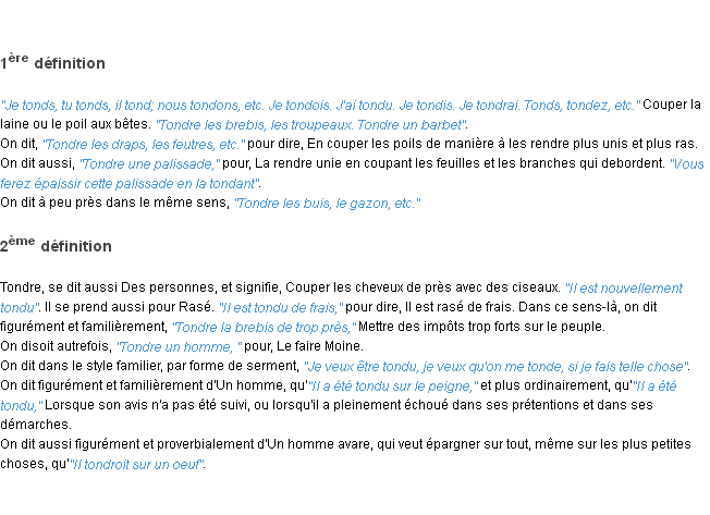 Ancienne signification éditée en 1835 pour le terme « tondre » par l’Académie Française.