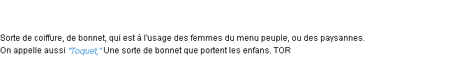 Ancienne signification éditée en 17962 pour le terme « toquet » par l’Académie Française.Merci à étienne et Sandrine pour la numérisation du mot toquet.