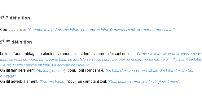 Signification éditée en 2010 par l’équipe de la-definition.fr.Merci à Rémi et Philibert pour la numérisation du mot total.