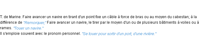 Définition de l’équipe de la-definition.fr (édition de 2009) pour le mot « touer ».Merci à Valérie et Edmond pour la numérisation du mot touer.