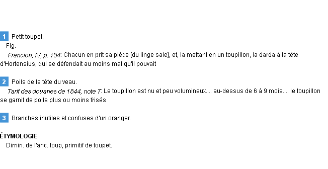 Signification éditée en 1876 pour le terme « toupillon » par Emile Littré.Merci à Désirée et Micheline pour la numérisation du mot toupillon.