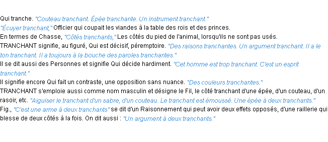 Signification éditée en 2010 par l’équipe de la-definition.fr.Merci à Perrine et Mélissa pour la numérisation du mot tranchant.
