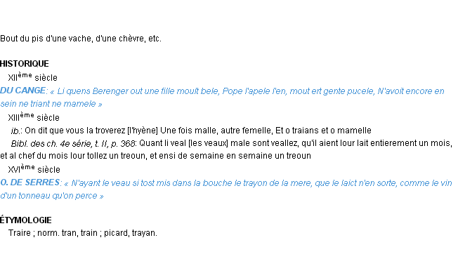 Définition d’Emile Littré (édition de 1876) pour le mot « trayon ».Merci à Fernande et Angèle pour la numérisation du mot trayon.