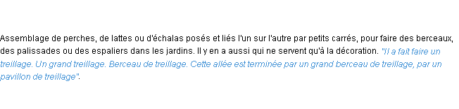 Définition du mot « treillage » par l’équipe de la-definition.fr (édition de 2011).Merci à Sébastienne et Stéphane pour la numérisation du mot treillage.