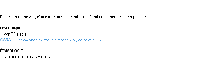 Définition d’Emile Littré (édition de 1876) pour le mot « unanimement ».