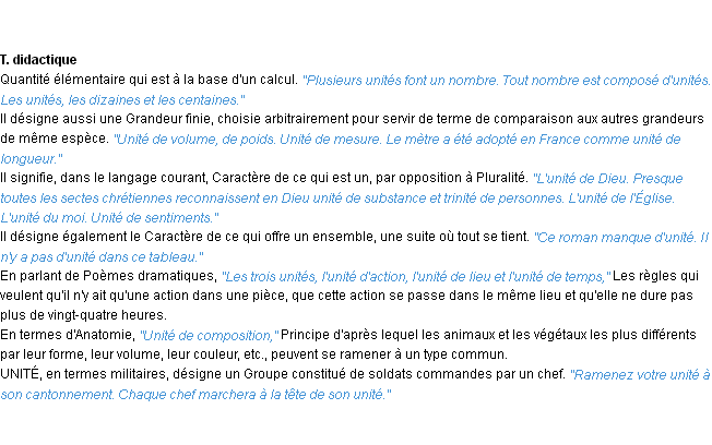 Signification développée en 1788 par Mr Féraud (dictionnaire dit « le Féraud »).Merci à Noel et Désirée pour la numérisation du mot unité.