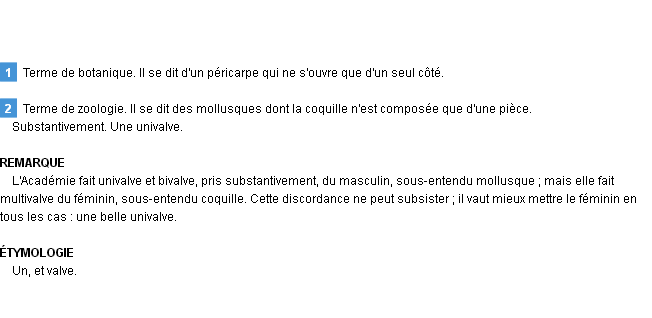 Signification du terme « univalve », parution de 1932, dictionnaire académique Français.