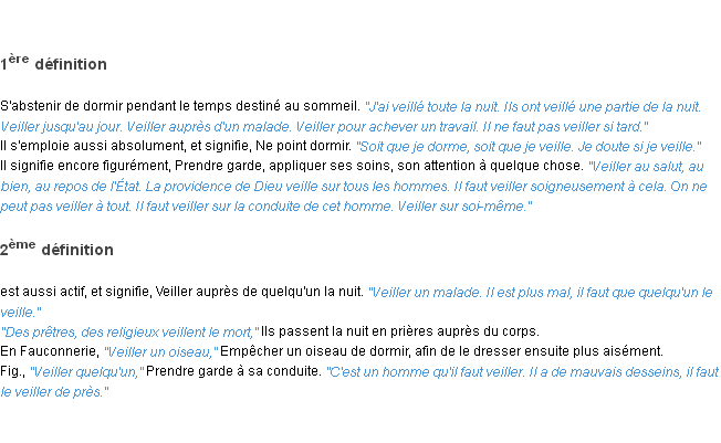 Ancienne définition « veiller » du dictionnaire académique Français, parution de l’année 1835.