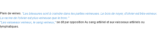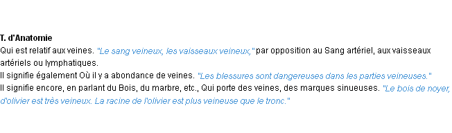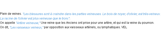 Définition développée dans dictionnaire d’Emile Littré (ancienne édition de 1876).Merci à Geneviève et Mireille pour la numérisation du mot veineux.