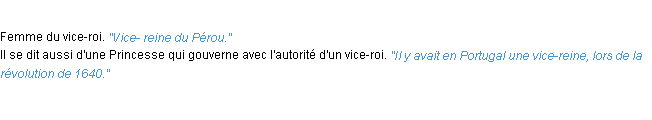 Définition de « vice-reine » issue du Littré (Auteur Emile Littré, édité en 1876).Merci à Stéphane et Amaury pour la numérisation du mot vice-reine.