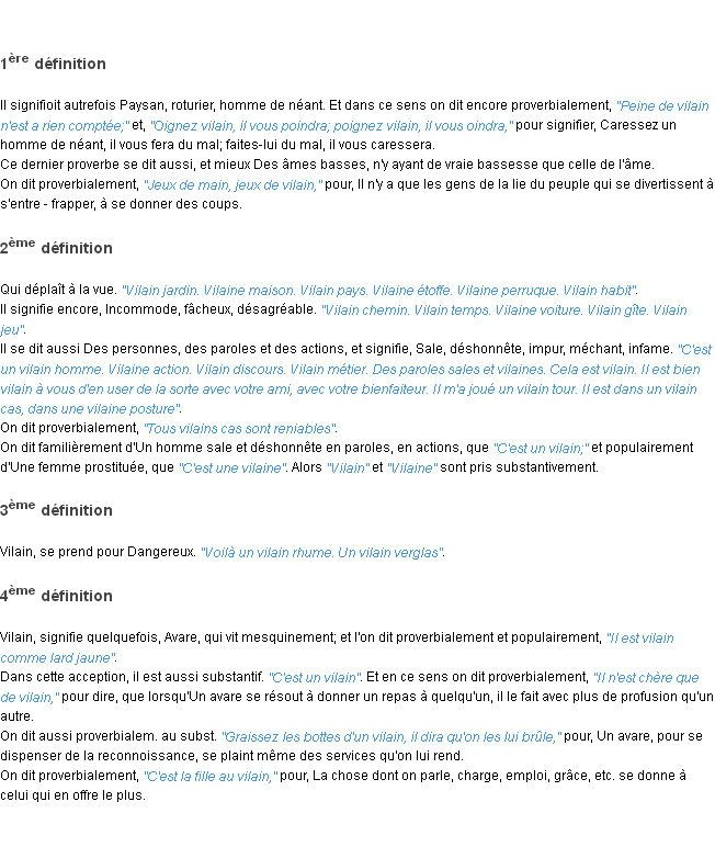 Définition de l’équipe de la-definition.fr (édition de 2009) pour le mot « vilain ».Merci à Corin et Clementine pour la numérisation du mot vilain.