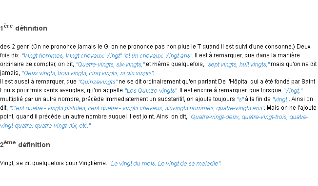 Ancienne définition de l’Académie Française (édition de 1835) pour le mot « vingt ».