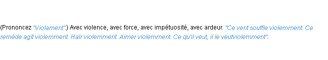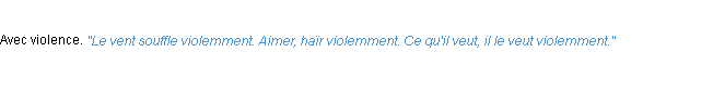 Signification du terme « violemment », parution de 1876 (dictionnaire le Littré).Merci à Ambre et Sylvianne pour la numérisation du mot violemment.