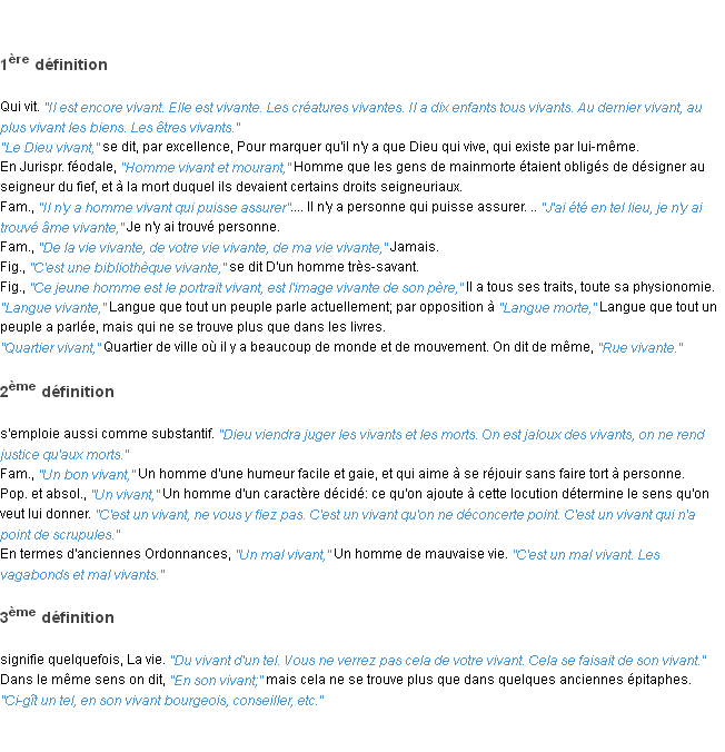 Ancienne signification éditée en 1835 pour le terme « vivant » par l’Académie Française.