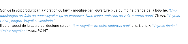 Signification éditée en 2010 par l’équipe de la-definition.fr.Merci à Michèle et Joséphine pour la numérisation du mot voyelle.